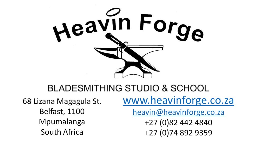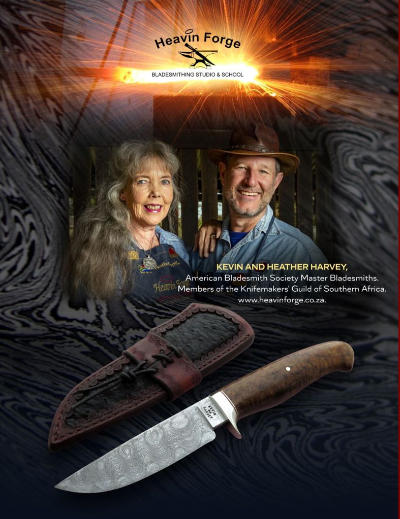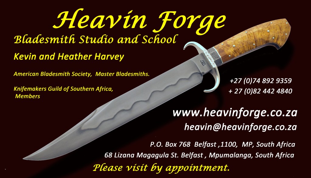 Kevin and Heather are both authorized instructors in Bladesmithing with the American Bladesmith Society. Regular classes are presented at their Heavin Forge Bladesmithing Studio and School in South Africa. They have also taught at the Bill Moran School of Bladesmithing in the U.S.A. Heavin Forge, their bladesmithing school, is one of nine ABS-recognized schools globally, with seven of them being in the U.S.A, and one in Belgium.